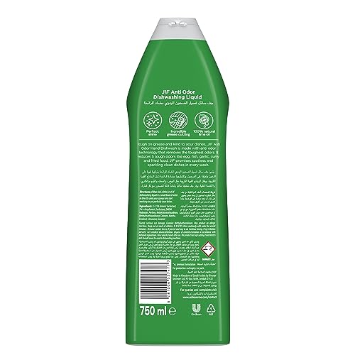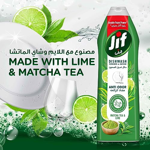 Achieve superior cleaning and eliminate odors with Jif Anti Odor Dishwashing Liquid. This 750 ml bottle features a refreshing lime and matcha tea scent and double foam power for effective grease removal and odor control.
